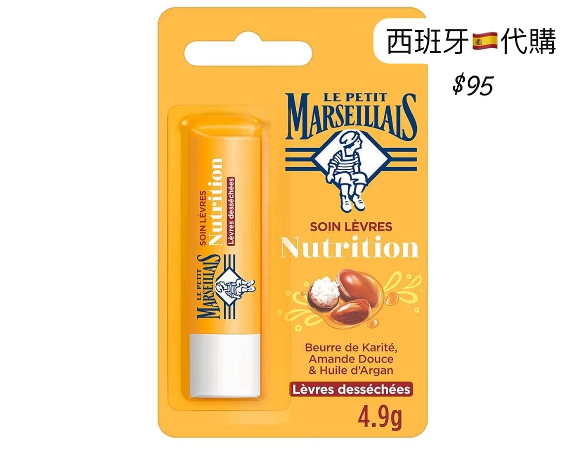 小馬牌 滋養護唇膏(單支) Le Petit Marseillais – Soin Lèvres Nutrition** 主要功效: • 深層滋養乾燥、脫皮雙唇 • 修護並維持柔嫩彈性 • 形成保濕屏障,改善乾裂情況 主要成分: • 乳油木果脂(Shea Butter) • 甜杏仁油(Amande Douce) • 摩洛哥堅果油(Argan Oil) 適用對象: ✔ 嘴唇乾燥、粗糙、易脫皮者 容量: 4.9g