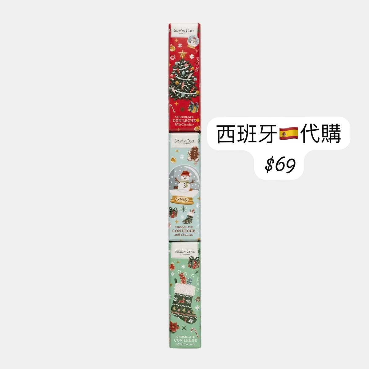 🟠 🎄 聖誕主題巧克力棒三入組(Chocolate con Leche Christmas Edition – 3 Bars Set) 這款聖誕限定系列以冬日節慶插畫包裝設計,色彩溫暖可愛,內含 3 條牛奶巧克力棒。 每條包裝皆有不同的節日圖案(聖誕樹、雪人、襪子、薑餅人等),濃郁奶香搭配滑順口感,讓節慶氣氛更甜蜜。 🧣 特色: • 使用 32% 可可含量的優質牛奶巧克力 • 不含棕櫚油與麩質 • 西班牙原裝進口 • 每條淨重 30g,總重 90g 適合當作聖誕交換禮物、小禮包或節慶甜點搭配。