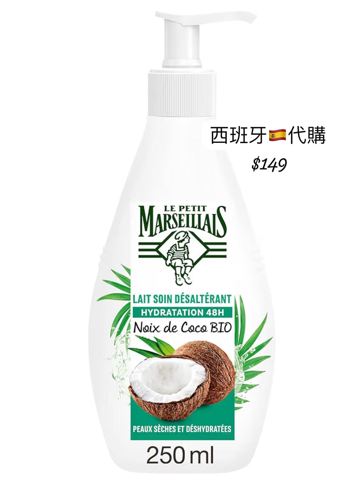 小馬牌 48 小時保濕椰子身體乳 Le Petit Marseillais – Lait Soin Désaltérant Hydratation 48H (Coco BIO)** 主要功效: • 提供長效 48 小時保濕 • 質地清爽,迅速吸收 • 舒緩乾燥、缺水肌膚 主要成分: • 有機椰子(Noix de Coco BIO) • 溫和保濕植物萃取 適用肌膚: ✔ 乾燥及缺水肌 容量: 250 ml