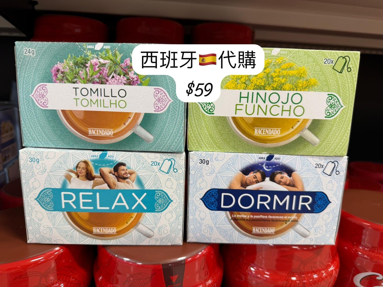 🌿 1. TOMILLO(百里香茶 / Tomilho) • 主要功效: 幫助舒緩喉嚨不適、促進呼吸道健康,亦可支持免疫系統。 • 主要成分: 百里香(Thymus vulgaris),富含抗氧化成分與天然精油。 • 適合飲用時機: 天氣變化時、喉嚨乾癢或輕微感冒時飲用。 • 包裝規格: 24g(20 袋) 💡 百里香茶味道溫和略帶草香,可搭配蜂蜜飲用以增添風味。 ⸻ 🌼 2. HINOJO(茴香茶 / Funcho) • 主要功效: 幫助消化、減少腹脹與腸胃氣體。 • 主要成分: 茴香籽(Foeniculum vulgare),具放鬆腸道、促進食物吸收的作用。 • 適合飲用時機: 飯後飲用,有助消化與緩解腸胃不適。 • 包裝規格: 40g(20 袋) 💡 特別適合消化不良或經常脹氣的人。 ⸻ 🌸 3. RELAX(放鬆草本茶) • 主要功效: 幫助放鬆身心、減輕壓力與焦慮。 • 主要成分: 通常包含檸檬香蜂草、甘菊、薰衣草、馬鞭草等鎮靜草本。 • 適合飲用時機: 下午或晚上,忙碌一天後飲用以放鬆情緒。 • 包裝規格: 30g(20 袋) 💡 適合長期壓力大、需要幫助身心平靜的人群。 ⸻ 🌙 4. DORMIR(助眠茶) • 主要功效: 幫助入睡、改善睡眠品質。 • 主要成分: 洋甘菊、香蜂草、百香果花(Pasiflora)等天然助眠草本。 • 適合飲用時機: 睡前 30 分鐘飲用,有助於放鬆與自然入睡。 • 包裝規格: 30g(20 袋) 💡 無咖啡因、味道柔和,是天然的夜間助眠飲品。