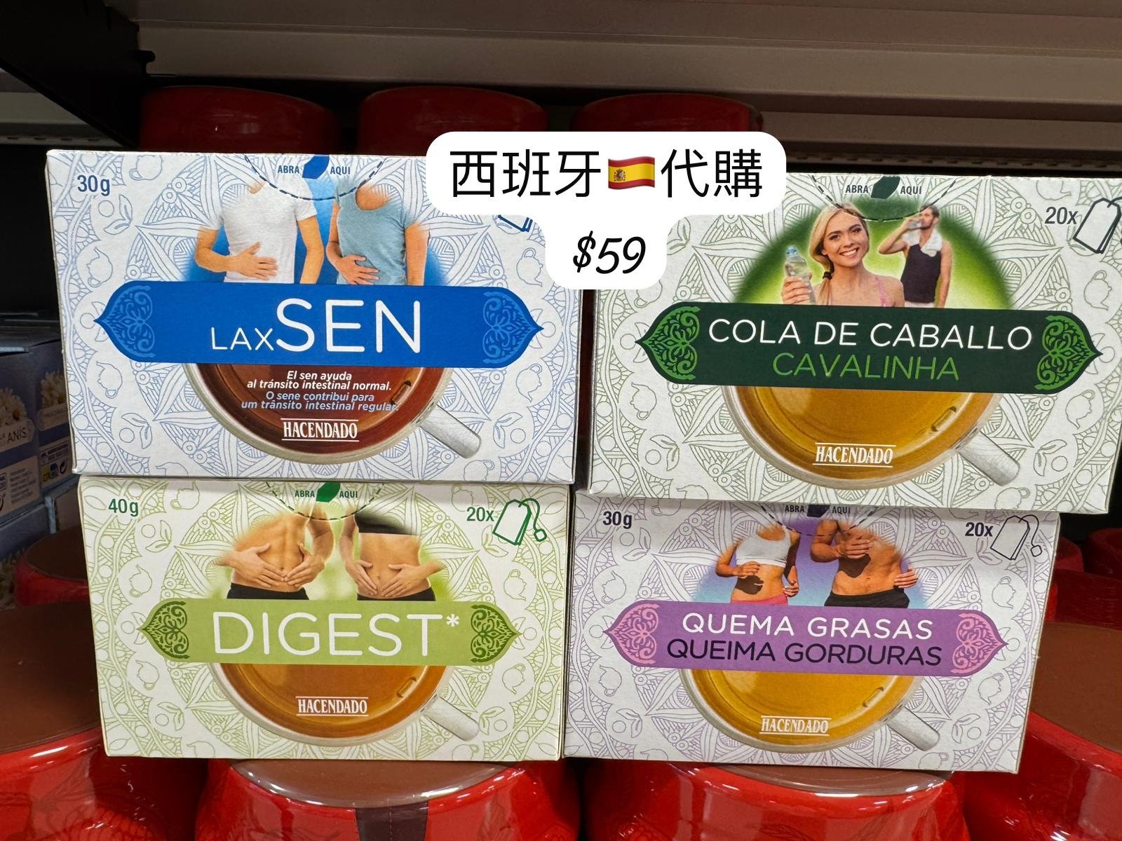 🍵 1. LAX SEN(藥蜀葵通便茶) • 主要功效: 幫助維持正常腸道蠕動,促進排便順暢。 • 主要成分: 當中含有 番瀉葉(Senna),是一種天然植物性輕瀉劑。 • 建議飲用時機: 晚餐後或睡前飲用,有助於改善便秘問題。 • 包裝規格: 30g(20 袋) 💡 適合有便秘困擾、腸道運行緩慢的人,但不建議長期每日飲用。 ⸻ 🌿 2. COLA DE CABALLO(木賊草茶 / Cavalinha) • 主要功效: 幫助利尿、排毒、減少水腫。 • 主要成分: 木賊草(Equisetum arvense),含豐富矽元素與抗氧化成分。 • 建議飲用時機: 早上或下午飲用,可作為天然排水茶。 • 包裝規格: 30g(20 袋) 💡 對於想要改善水腫、促進代謝的人很適合。 ⸻ ☘️ 3. DIGEST(消化茶) • 主要功效: 幫助促進腸胃消化、減緩腹脹與胃部不適。 • 主要成分: 通常含有薄荷、洋甘菊、茴香、檸檬香蜂草等天然草本。 • 建議飲用時機: 飯後飲用,特別適合消化不良或脹氣時。 • 包裝規格: 40g(20 袋) 💡 是 Hacendado 系列中非常受歡迎的一款,適合日常餐後飲用。 ⸻ 🔥 4. QUEMA GRASAS(燃脂茶 / Queima Gorduras) • 主要功效: 幫助促進脂肪代謝、支持減重與排毒。 • 主要成分: 綠茶、馬黛茶、洛神花、檸檬草等。 • 建議飲用時機: 飯前或運動前飲用,有助於提升新陳代謝。 • 包裝規格: 30g(20 袋) 💡 適合希望輕鬆輔助控制體重或塑身的人群。