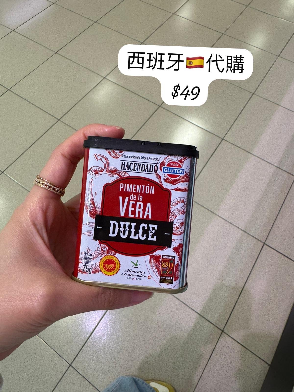 🌶️ Hacendado Pimentón de la Vera Dulce(維拉甜紅椒粉) 🏅 原產地認證(D.O.P. La Vera) — 西班牙極品紅椒粉 ⸻ 💎 產品介紹 這款「Pimentón de la Vera Dulce」是來自西班牙 La Vera 地區(埃斯特雷馬杜拉) 的原產地認證紅椒粉。 採用當地紅椒以橡木煙燻乾燥,再研磨成粉, 因此帶有獨特的 煙燻香氣(ahumado) 與甘甜風味。 ⸻ 🌿 產品特色 • D.O.P. La Vera 認證,品質保證。 • 以橡木煙燻乾燥紅椒製成。 • 味道柔和但香氣濃郁,是許多西班牙料理的靈魂調味。 • 無麩質(Sin Gluten),適合特殊飲食者。 • 廚師級用料,常見於西班牙香腸(Chorizo)及海鮮燉飯。 ⸻ 📦 產品資訊 • 品牌: Hacendado • 品名: Pimentón de la Vera Dulce • 中文名稱: 維拉甜紅椒粉 • 淨重: 75g • 認證: D.O.P.(Denominación de Origen Protegida) • 產地: 西班牙 La Vera 地區 ⸻ 🍽️ 使用建議 • 經典用途: 西班牙香腸(Chorizo)與燉飯。 • 煙燻風味料理: 烤肉、蔬菜、馬鈴薯或豆類湯。 • 料理提香提色: 添加於油中炒香,釋出鮮紅色與香味。
