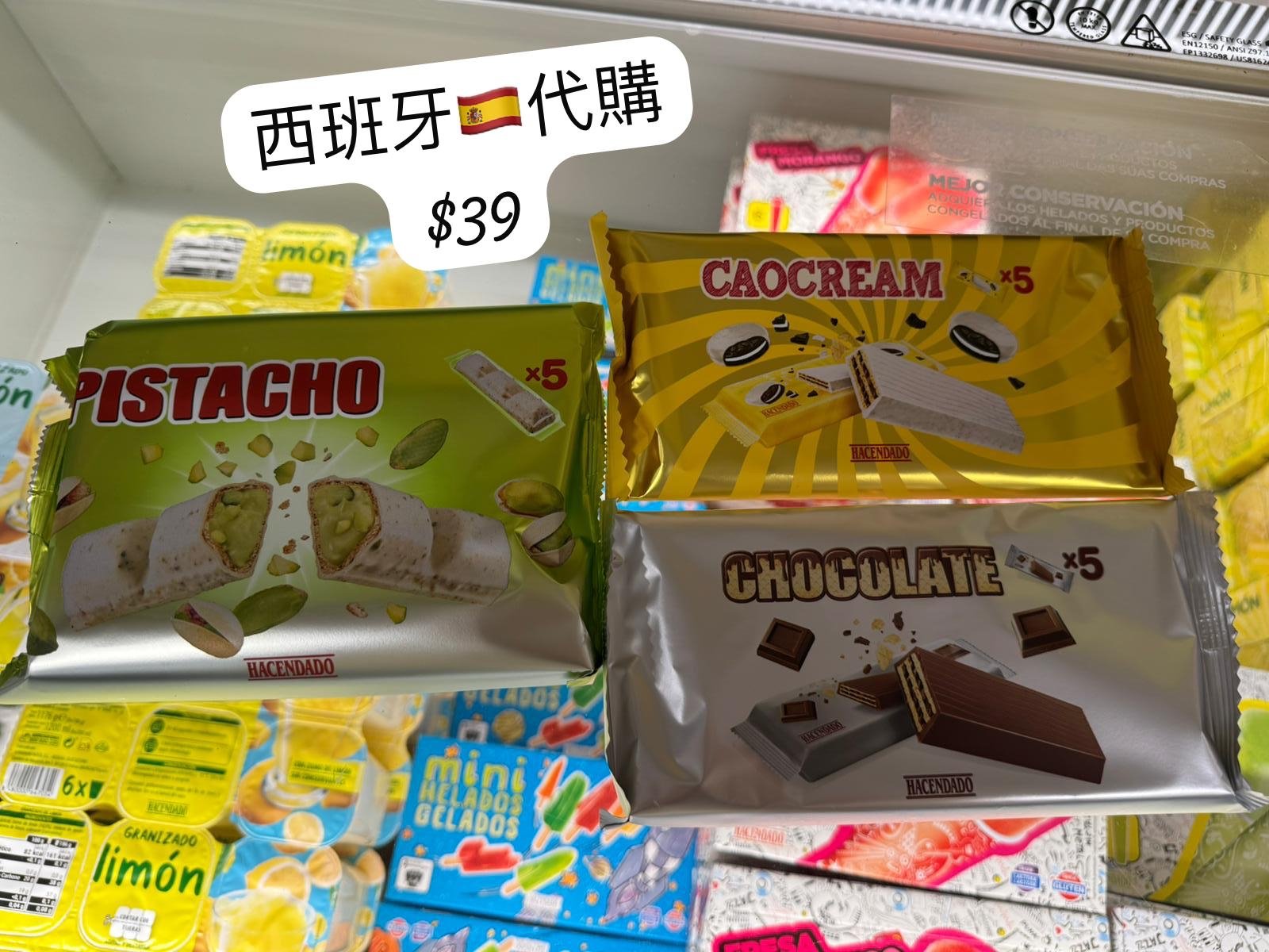 🍦 Hacendado Ice Cream Sandwich Bars 威化冰淇淋夾心系列(5入裝) 🇪🇸 西班牙熱銷經典・濃郁滑順的幸福滋味 這系列冰淇淋以香脆威化餅夾入綿密冰淇淋內餡,口感層次分明、甜而不膩。每包內含 5 份獨立冰淇淋棒,方便分食,無論是家庭甜點或夏日午後解暑都非常合適。 ⸻ ✨ 三款人氣口味介紹 🟩 Pistachio(開心果) • 綠色包裝・濃郁堅果香氣。 • 內餡為滑順的開心果冰淇淋,夾雜碎粒提升口感。 • 味道濃郁卻不膩,深受堅果愛好者喜愛。 ⸻ 🤎 Chocolate(巧克力) • 經典可可風味,外層威化酥脆、內餡柔滑濃厚。 • 採用高品質可可製成,甜度適中,香氣持久。 • 是最受歡迎的經典口味,老少咸宜。 ⸻ 💛 Chocream(香草夾心巧克力威化) • 黃色包裝,風味靈感來自「Oreo+香草冰淇淋」組合。 • 香草冰淇淋夾心帶有淡淡可可香氣,外層威化酥鬆。 • 味道清爽、口感豐富,是夏天首選的甜點風味。
