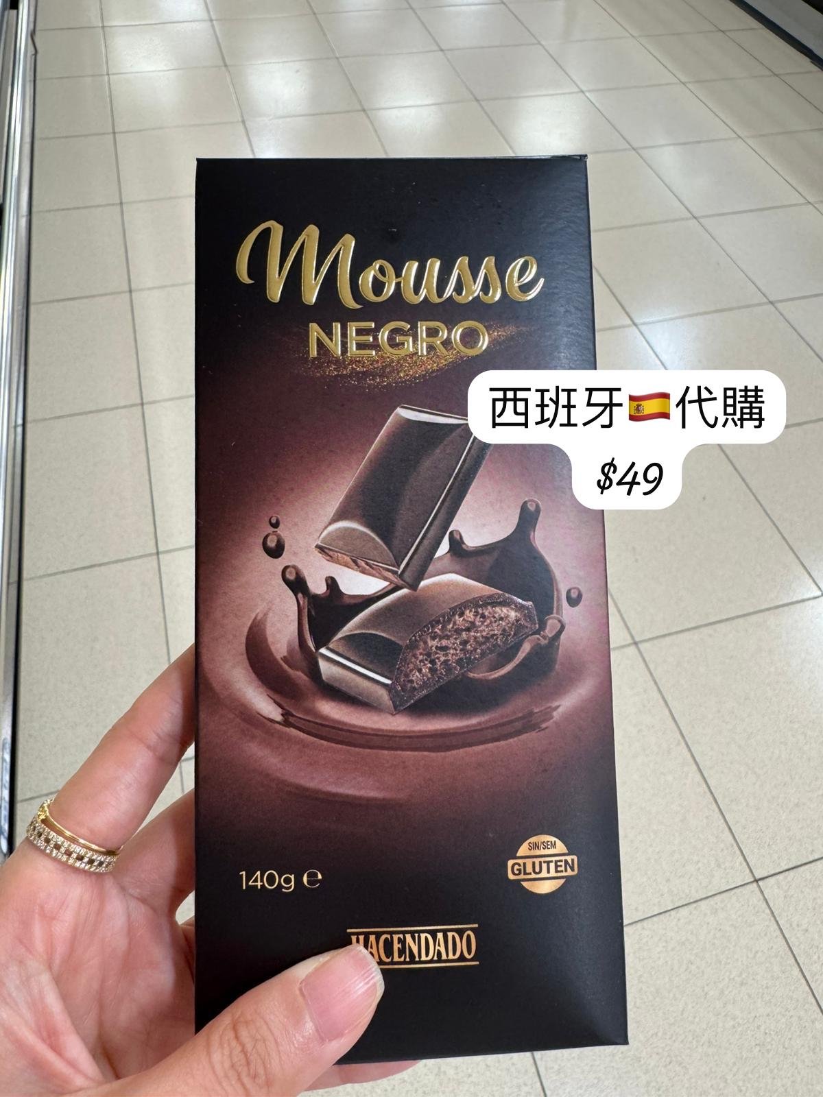 🍫 Hacendado Mousse Negro 黑巧克力慕斯夾心巧克力(140g) 🌟 綿密慕斯夾心 × 濃厚黑巧外層的完美融合 這款「Mousse Negro」巧克力以 黑巧克力外層 包裹著 輕盈細滑的可可慕斯內餡,呈現出入口即化的雙層口感。 外層略帶苦味的可可香氣,搭配內層蓬鬆柔滑的慕斯質地,甜度適中,是黑巧愛好者與喜歡層次口感者的理想選擇。 ⸻ ✨ 產品特色 • 🍫 雙層口感設計:外層濃郁黑巧克力,內餡輕盈慕斯夾心。 • ☁️ 慕斯質地細緻:入口柔滑、即化不膩。 • 🌾 無麩質(Sin Gluten):適合麩質敏感者。 • ⚖️ 重量 140g:份量適中,適合分享或獨享。 • 💎 高質感包裝:霧面黑底金字設計,簡約高貴。 ⸻ 📋 產品資訊 • 品牌:Hacendado(Mercadona) • 名稱:Mousse Negro • 重量:140 公克 • 主要成分:可可塊、可可脂、糖、乳化劑(大豆卵磷脂)、香料。 • 可可含量:約 50–60%(偏濃郁但仍保留滑順甜味) • 保存方式:置於陰涼乾燥處,避免陽光直射或高溫環境。 ⸻ 🍮 品嚐建議 • 💖 冷藏後享用:可提升慕斯層的綿密感與整體濃度。 • ☕ 搭配飲品:適合與濃縮咖啡、紅茶或香草牛奶搭配。 • 🍰 甜點應用:可切塊作為慕斯蛋糕、布朗尼或冰淇淋的裝飾。