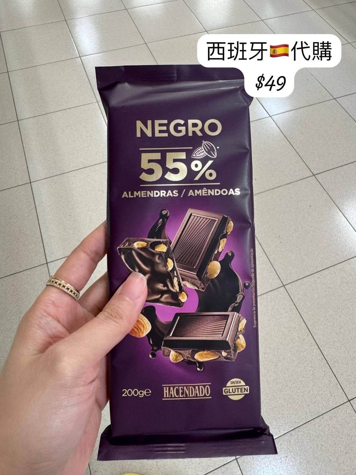 🍫 Hacendado Negro 55% Almendras 黑巧克力杏仁(200g) 🌰 經典可可香 × 香脆杏仁的完美結合 這款巧克力選用 55% 可可固形物 的黑巧克力,甜度與苦味取得絕佳平衡。 內含 整顆烘烤杏仁,帶出天然堅果香氣與酥脆口感。 整體風味濃郁卻不苦澀,是喜愛「成熟系」巧克力的人首選。 ⸻ ✨ 產品特色 • 🍫 55% 可可含量:風味濃郁、香氣飽滿,甜度中等偏低。 • 🌰 整顆杏仁添加:烘烤後香脆可口,增添口感層次。 • 🧑🍳 可直接食用或作為烘焙巧克力使用:適合切碎加入餅乾、布朗尼或甜點中。 • 🌾 無麩質(Sin Gluten):適合麩質不耐或追求純淨成分的消費者。 • ⚖️ 200 公克大包裝:方便分享或分次使用。 • 💜 包裝設計:深紫色霧面搭配金字字體,呈現高貴典雅質感。 ⸻ 📋 產品資訊 • 品牌:Hacendado(Mercadona) • 名稱:Chocolate Negro 55% con Almendras / Amêndoas • 重量:200g • 主要成分:可可塊、糖、可可脂、杏仁(約10–15%)、乳化劑(大豆卵磷脂)、香草香料。 • 可可固形物含量:55% • 保存方式:放置於陰涼乾燥處,避免陽光直射或高溫。 ⸻ 🍷 建議搭配 • ☕ 咖啡:與濃縮黑咖啡或拿鐵搭配,風味更平衡。 • 🍷 紅酒:尤其是果香型或輕單寧紅酒(如 Tempranillo)能襯托巧克力與杏仁香氣。 • 🍰 甜點應用:可切碎混入餅乾麵糰、布朗尼、慕斯蛋糕中增添層次。