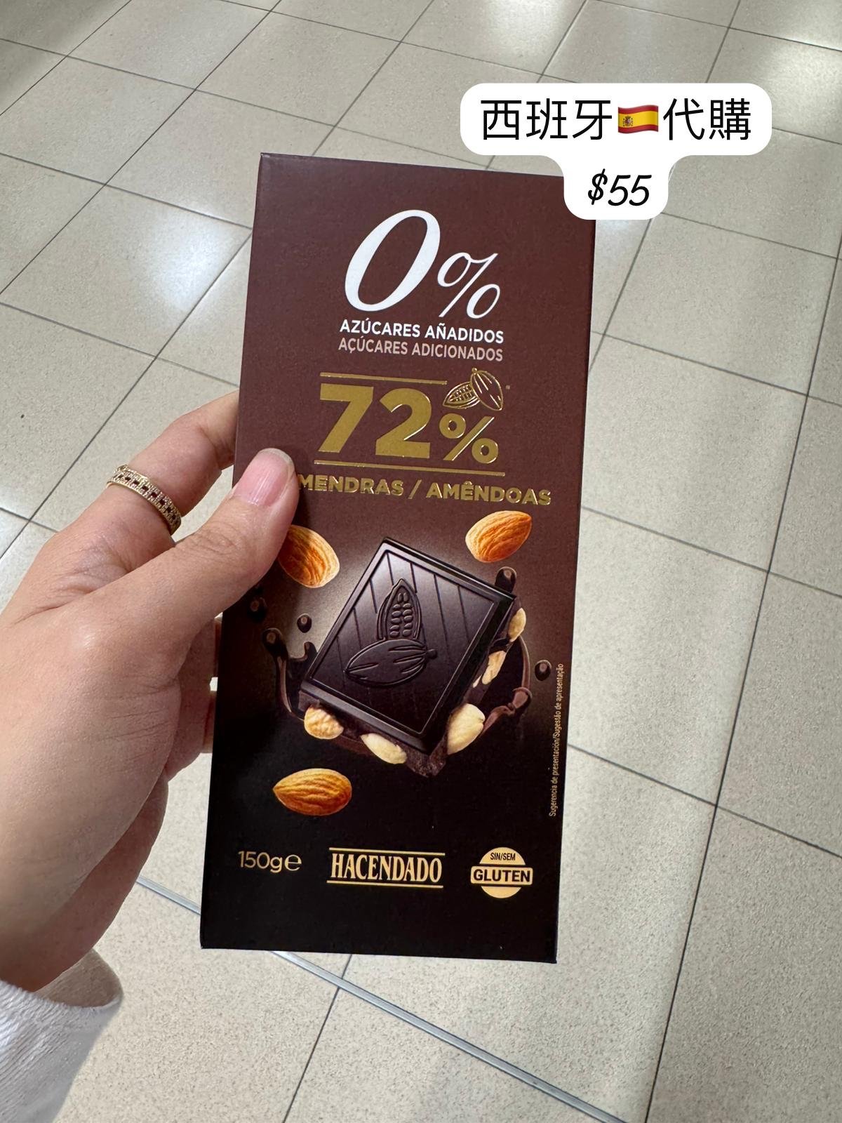 🍫 Hacendado Negro 72% Almendras – Sin Azúcares Añadidos (150g) 🌰 濃郁可可 × 健康無糖 × 香脆杏仁 這款巧克力選用 72% 可可含量,帶來明顯的可可苦韻與烘焙香, 再加入整顆烘烤杏仁,形成層次豐富的口感對比。 甜味來源為 麥芽糖醇(maltitol)或赤藻糖醇(erythritol), 整體甜度比普通版更柔和、不膩口。 ⸻ ✨ 產品特色 • 🍫 72% 可可含量:風味濃厚但不過苦。 • 🚫 0% 添加糖:以甜味劑取代蔗糖,適合控糖飲食。 • 🌰 含整顆杏仁:提供酥脆咀嚼感與堅果香氣。 • 🌾 無麩質(Sin Gluten):對麩質不耐者友好。 • ⚖️ 150g 包裝:介於標準巧克力板與大包裝之間。 • 🍃 適合生酮、低糖或糖尿病飲食者。 ⸻ 📋 基本資料 • 品牌:Hacendado(Mercadona) • 名稱:Chocolate Negro 72% con Almendras 0% Azúcares Añadidos • 重量:150g • 可可含量:72% • 甜味來源:甜味劑(maltitol / erythritol 等) • 主要成分:可可塊、可可脂、甜味劑、杏仁、乳化劑(大豆卵磷脂)、天然香草香料。 ⸻ ☕ 享用建議 • ☕ 搭配黑咖啡或濃縮咖啡:突顯可可苦韻。 • 🧀 搭配堅果起司拼盤:可平衡甜味與油脂感。 • 🧁 融化後製成甜點醬或低糖布朗尼:健康又香濃。