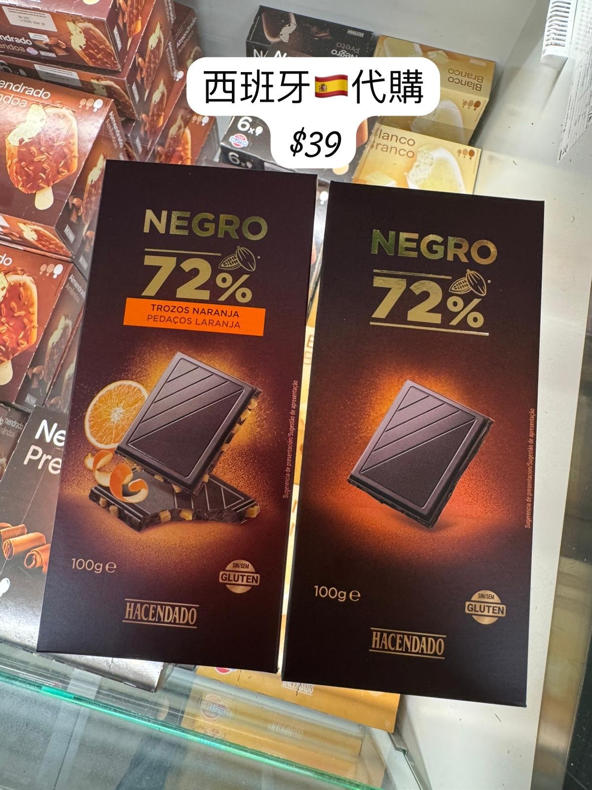 🍫 Hacendado Negro 72% Cacao 系列 ⚖️ 平衡派黑巧 × 絕佳入門選擇 這系列的可可含量為 72%,比 55% 更苦一點、但比 85% 或 99% 柔和許多。 它的風味乾淨圓潤,甜度適中,非常適合初次嘗試高可可黑巧克力的人。 ⸻ 🍊 左:Hacendado Negro 72% con Trozos de Naranja (橙皮碎片黑巧克力) ✨ 特色 • 含 72% 可可 + 橙皮粒(Trozos de Naranja)。 • 甜苦交織,伴隨清新柑橘香氣。 • 口感層次豐富:微酸橙皮與濃郁可可互相平衡。 • 含少量糖分,香氣明亮而不膩。 • 無麩質(Sin Gluten)。 🍷 搭配建議 • 適合搭配紅茶、果香紅酒或橙味甜酒。 • 也可用於甜點裝飾(如慕斯、可麗餅或提拉米蘇)。 ⸻ 🍫 右:Hacendado Negro 72% Cacao Clásico (經典純黑巧) ✨ 特色 • 含 72% 可可,苦甜平衡感極佳。 • 純粹展現可可豆香氣與烘焙香。 • 質地細滑、不帶果粒或香料。 • 無麩質(Sin Gluten)。 ☕ 搭配建議 • 搭配黑咖啡或濃茶,增強香氣對比。 • 是製作烘焙與甜點的理想黑巧基底。 ⸻ 📋 共同資訊 • 品牌:Hacendado(Mercadona) • 重量:100g • 可可含量:72% • 特色:無麩質、口感細緻、香氣濃郁 • 保存方式:陰涼乾燥處,避免陽光直射。