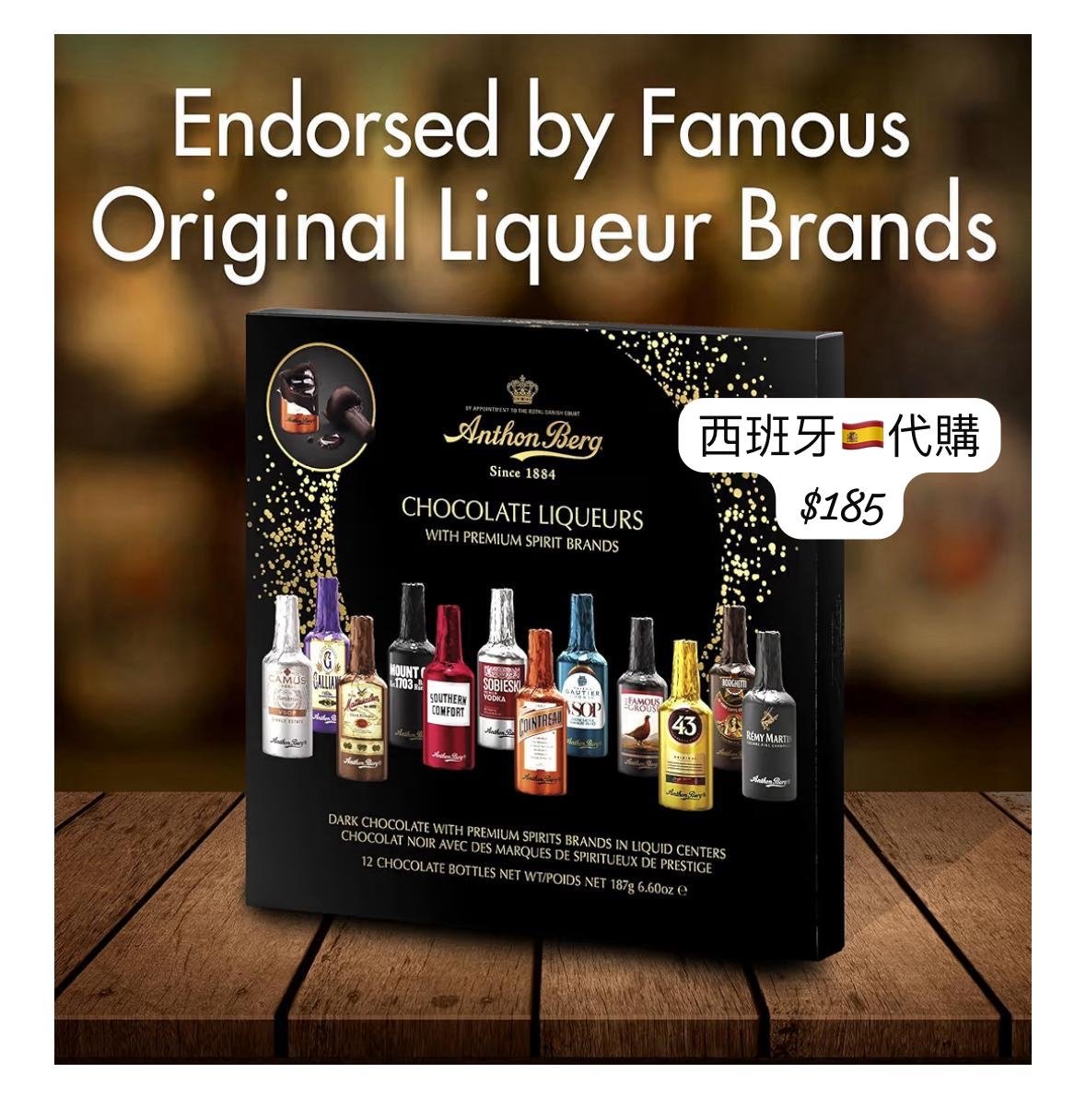 Anthon Berg 經典酒心巧克力禮盒(Chocolate Liqueurs) ⭐ 歷史悠久的丹麥皇室御用巧克力品牌(創立於 1884 年) Anthon Berg 是享譽全球的丹麥巧克力品牌,以精緻的酒心巧克力聞名。本系列更獲多家國際知名酒類品牌授權,是喜愛巧克力與烈酒融合風味者的首選。 ⸻ 🍫 產品特色 ✅ 國際知名酒品牌授權合作 禮盒內每一顆巧克力都是以迷你酒瓶造型呈現,內含來自世界各地的高級烈酒,例如: • Rémy Martin 人頭馬干邑 • Cointreau 君度橙酒 • Southern Comfort 南方舒適 • Mount Gay Rum • Famous Grouse 釀鷹威士忌 • 以及其他多款經典酒款 每款皆為品牌官方授權,風味純正。 ⸻ ✅ 50% 黑巧克力外層 外層採用濃度約 50% 的高品質黑巧克力,帶有微苦、醇厚的口感,與內層酒液形成完美平衡。 ⸻ ✅ 液態酒心設計 巧克力入口後,薄脆的外層巧克力會釋放出濃郁酒香,帶來「咬下即啜飲」的獨特體驗,回味悠長。 ⸻ 🎁 包裝內容 • 12 入禮盒 • 單顆皆為獨立包裝、造型迷你精緻,非常適合送禮或聚會分享。 ⸻ 🍷 注意事項 • 內含 少量酒精,兒童、孕婦及對酒精敏感者不建議食用。 • 開車前請勿過量食用酒心巧克力。