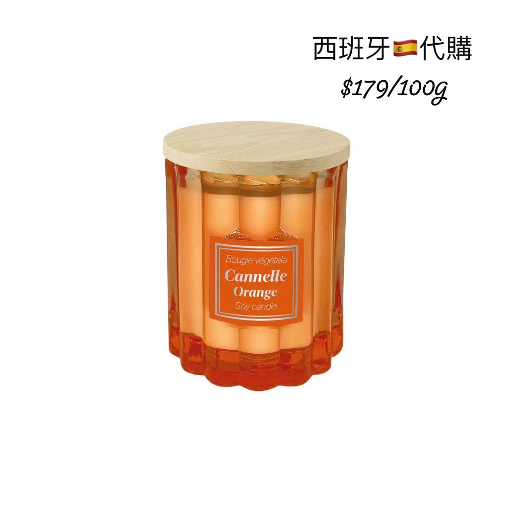 香氛大豆蠟燭(Bougie végétale Soy Candle) 外型為彩色玻璃瓶+木蓋設計,容量通常為大豆蠟香氛蠟燭,屬典雅法式風格。 🧡 Cannelle Orange(肉桂橙香) 香味特色: 活潑的甜橙香融合微辣的肉桂香料,帶節慶感與溫暖氛圍。 中文介紹: 帶有聖誕季節感的香氣,橙皮清香與肉桂交織,清新又帶溫度。