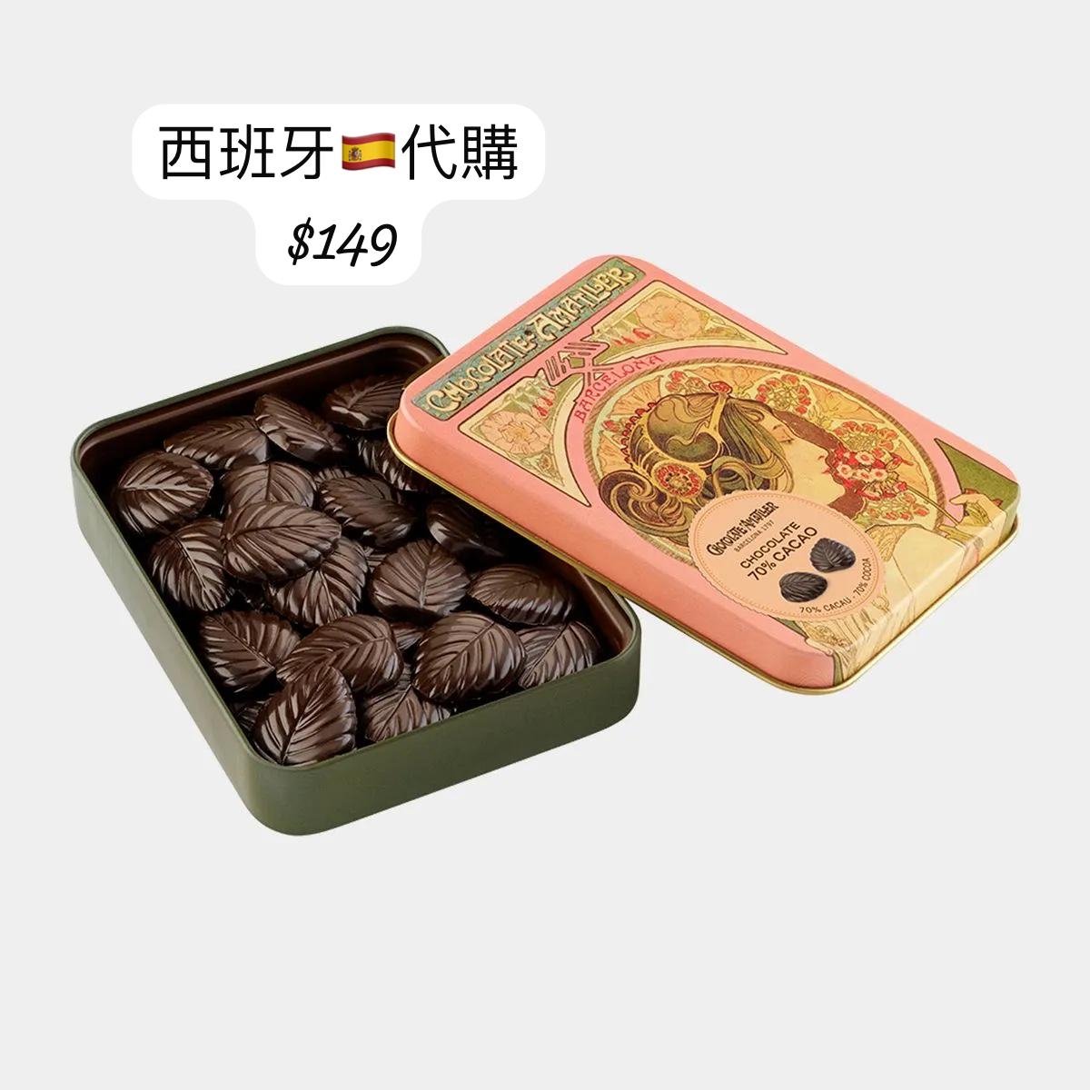 🌺 粉金鐵盒 — 經典 70% 黑巧克力葉片 Chocolate Amatller – 70% Dark Chocolate Leaves 產品介紹 • 口味特色: 採用嚴選可可豆製作的70% 黑巧克力,純粹濃郁,帶有自然果酸與可可香氣。 無夾心、無添加香料,呈現最經典的黑巧克力風味。 苦甜平衡,入口即化,餘味清爽。 • 造型設計: 葉片造型薄片巧克力,質地酥脆細滑,是 Amatller 的代表作之一。 包裝特色 • 粉金復古鐵盒,封面印有新藝術風格插畫。 • 高雅細膩,兼具藝術性與實用性。 ⸻ 📦 規格說明 • 可可含量:70% • 淨重:200 克 • 產地:西班牙(Barcelona) • 保存方式:置於陰涼乾燥處,避免陽光直射與高溫
