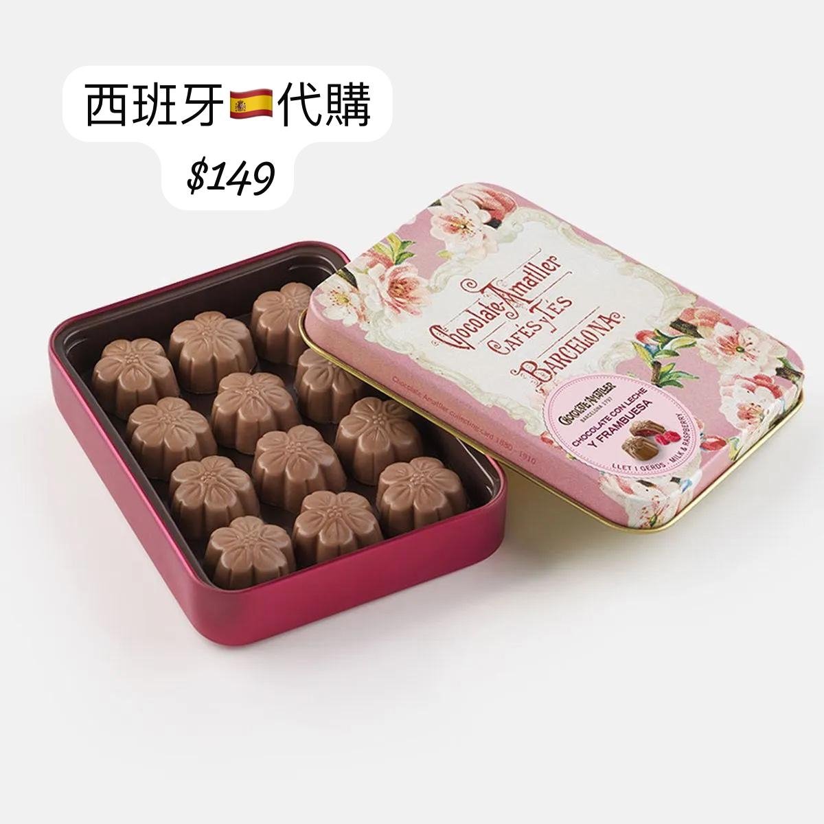 🍓 粉紅鐵盒 — 牛奶巧克力覆盆子夾心 Chocolate Amatller – Bombones de Chocolate con Leche y Frambuesa 產品介紹 • 口味特色: 採用順滑香濃的牛奶巧克力外層,包裹著酸甜可口的覆盆子夾心(Raspberry Ganache)。 果香與奶香交織,入口柔滑細膩,甜而不膩,帶有清新莓果香氣。 • 造型設計: 經典 Amatller 花形巧克力,外型精緻,內餡飽滿。 包裝特色 • 採用 粉紅花卉復古鐵盒,靈感取自 1900 年代西班牙新藝術風格插畫。 • 鐵盒可重複使用,具收藏價值與禮品質感。