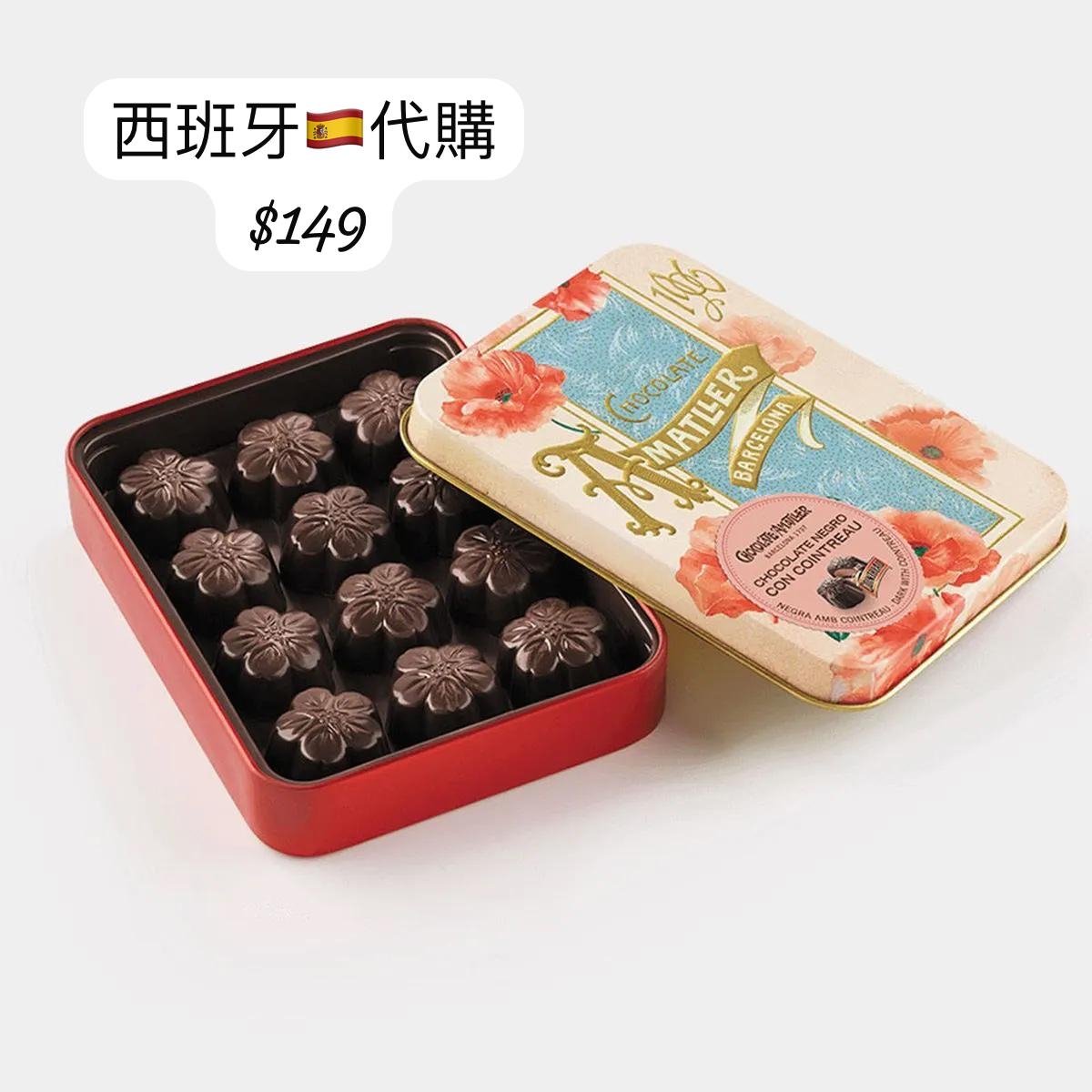 🍊 紅罌粟花鐵盒 — 黑巧克力君度橙酒夾心 Chocolate Amatller – Bombones de Chocolate Negro con Cointreau 產品介紹 • 口味特色: 採用香氣濃厚的70% 黑巧克力外層,內餡為帶有橙皮芳香的法國君度橙酒(Cointreau)利口酒奶油夾心。 苦甜巧克力與橙香酒心交融,帶出高雅果香與微醺氣息,風味成熟迷人。 • 酒精含量: 極低,成人可安心食用。 包裝特色 • 紅色花卉復古鐵盒設計,典雅高貴。 • 結合 Amatller 經典花卉插畫風格,展現西班牙工藝之美。 ⸻ 📦 共同規格 • 內容量:150 克 • 可可含量: • 牛奶巧克力:約 32% • 黑巧克力:約 70% • 產地:西班牙(Barcelona) • 保存方式:置於陰涼乾燥處,避免高溫與陽光直射
