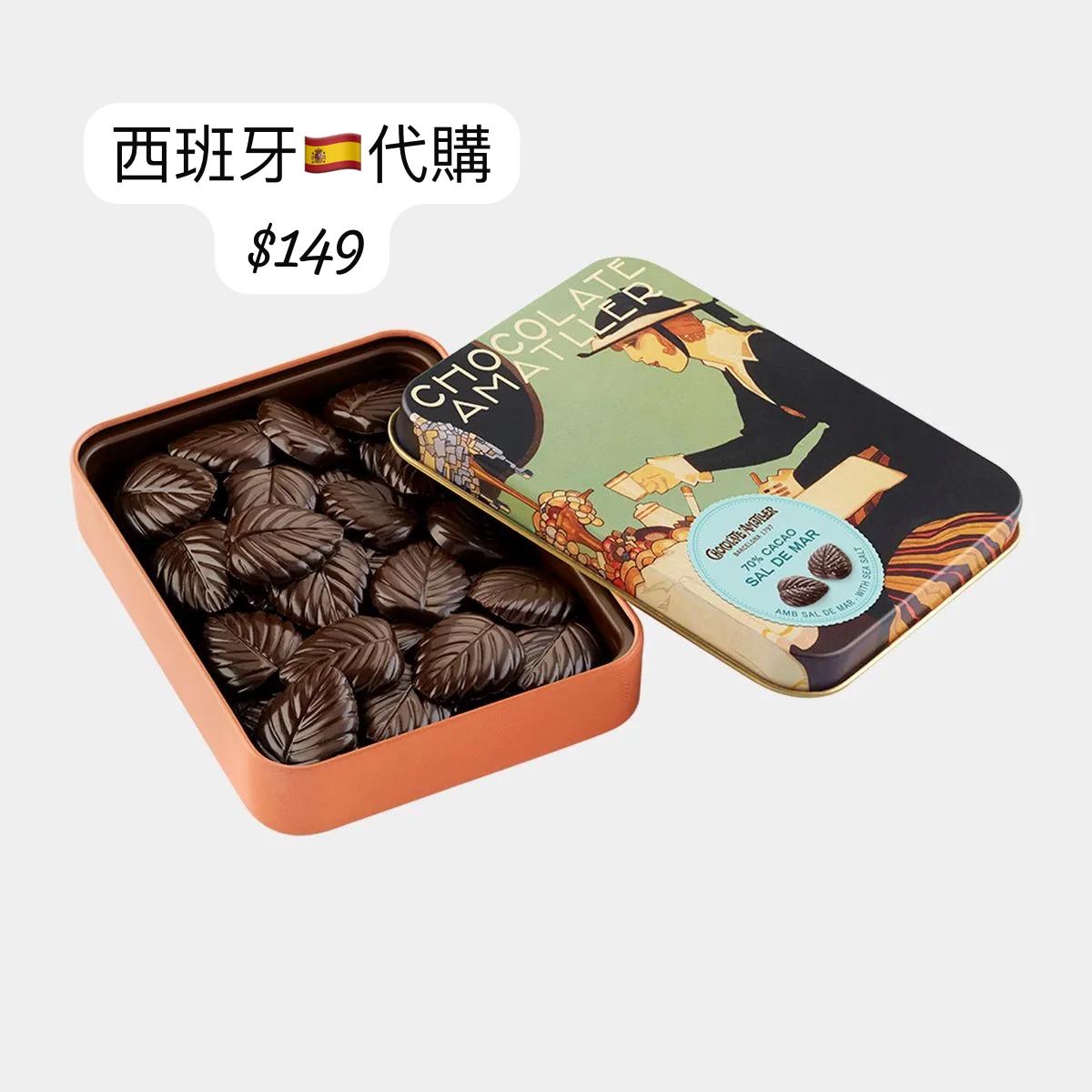 🍫 橙綠鐵盒 — 海鹽黑巧克力葉片 Chocolate Amatller – Dark Chocolate Leaves with Sea Salt (Flor de Sal) 產品介紹 • 口味特色: 採用70% 可可黑巧克力製成,加入西班牙天然海鹽結晶(Flor de Sal)。 巧克力的濃郁苦香中帶著微鹹層次,完美平衡苦甜味,口感細膩、後韻悠長。 是喜愛高純度可可與淡鹽風味者的理想選擇。 • 造型設計: 每片巧克力都以可可葉形狀設計,薄而酥脆,入口即化。 包裝特色 • 採用 經典復古鐵盒包裝,封面印有 1920 年代西班牙藝術插畫風格。 • 方便攜帶與保存,亦可作為收藏鐵盒或重複使用。