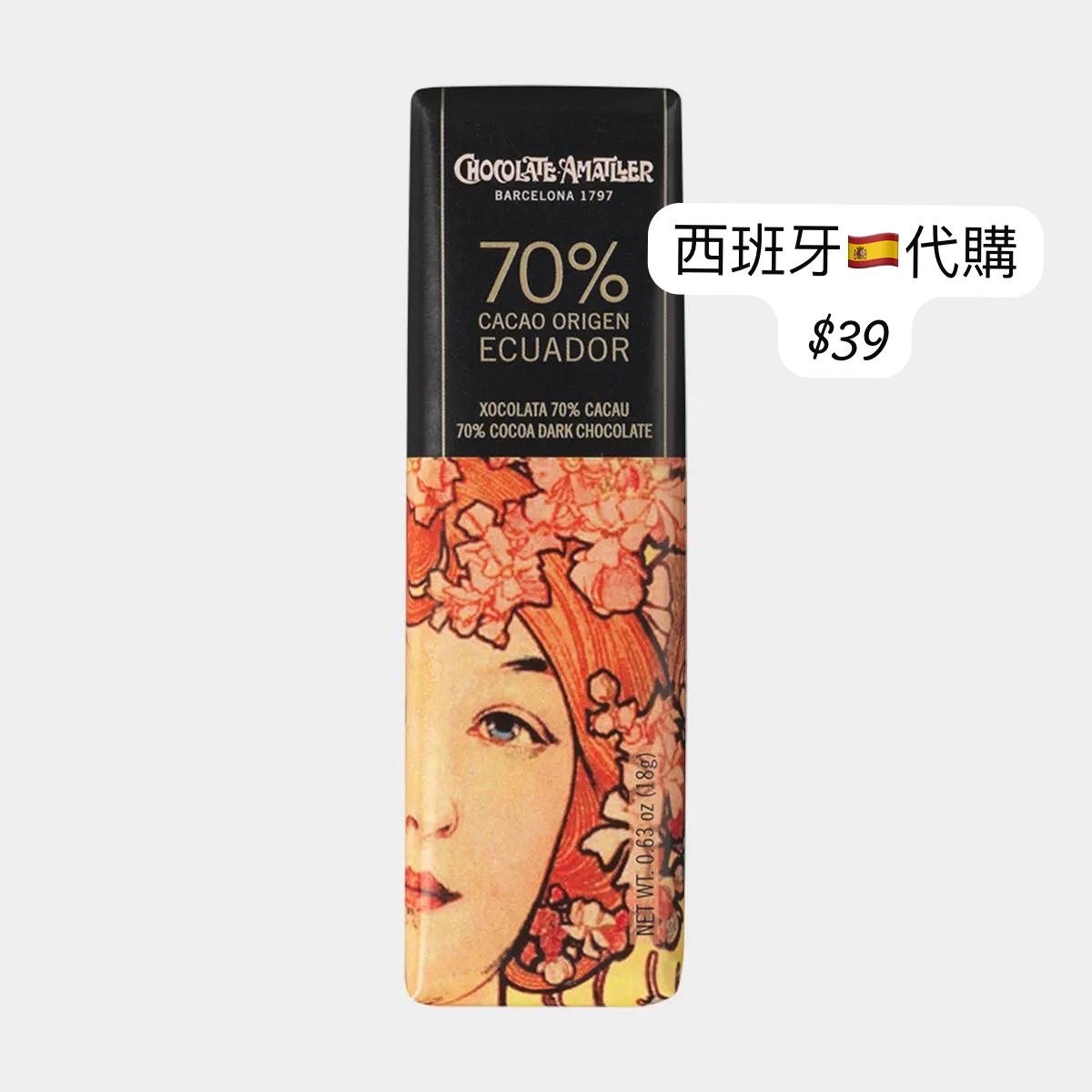 🤎 Chocolate Amatller 70% Cacao Origen Ecuador 黑巧克力棒(70% 厄瓜多單一產地可可)。 ⸻ 🍫 Chocolate Amatller 70% Cacao Origen Ecuador 黑巧克力棒 🇪🇸 品牌介紹 創立於 1797 年的 Chocolate Amatller(阿瑪特耶) 是西班牙歷史最悠久的巧克力品牌之一。 品牌以 藝術與巧克力的結合 為核心理念,堅持以傳統工藝與頂級可可豆製作每一款產品。 包裝設計靈感取自新藝術風格大師 Alphonse Mucha(慕夏) 的經典畫作,展現濃厚的歐洲藝術氣息與優雅格調。 ⸻ 🌱 可可來源 此款採用 厄瓜多(Ecuador)原產地可可豆,以其花香與果香聞名全球。 厄瓜多可可屬於珍稀的 Arriba Nacional 品種,擁有細膩芳香與獨特的花果調,是頂級巧克力常用的原料來源之一。 ⸻ 🍀 風味特徵 • 可可濃度: 70% • 口感層次: • 初味柔滑細膩,帶有淡淡花香; • 中段散發柑橘與熱帶水果的酸甜香氣; • 尾韻則以可可苦香與微酸平衡收尾。 • 風格: 精緻優雅,帶有明亮果酸與花香調,是偏向清新型黑巧的代表。 ⸻ ✨ 產品亮點 • 採用 單一產地可可豆(Single Origin Ecuador Cocoa)。 • 以純可可脂製成,不含棕櫚油與人工香料。 • 經典慕夏藝術包裝,兼具收藏與禮贈價值。 • 濃郁花果香氣,適合搭配紅酒、茶或咖啡品嚐。 ⸻ 📦 產品資訊 • 成分: 可可漿、可可脂、糖、天然香草精。 • 可可含量: 70% • 淨重: 18 克 • 原產地: 西班牙(Barcelona) • 保存方式: 存放於陰涼乾燥處,避免陽光直射及高溫環境。 ⸻ ☕ 建議搭配 • 錫蘭紅茶、烘焙烏龍 • 乾紅葡萄酒(如 Pinot Noir) • 或搭配堅果與乾果作為下午茶甜點