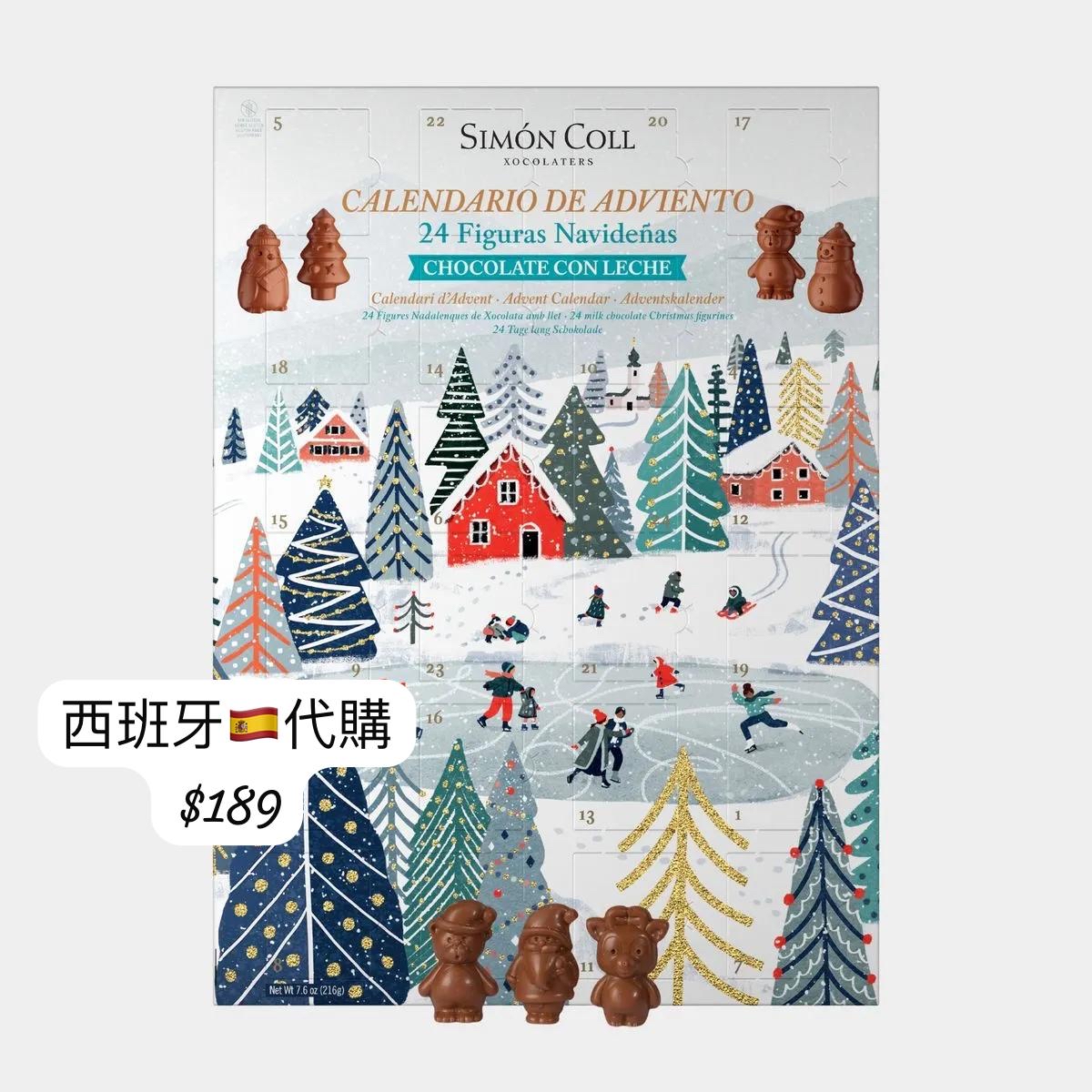 🟠 🌲 Christmas Village 冬季村莊主題倒數日曆 以雪中村莊為主題的插畫設計,畫面溫馨且帶有閃亮金粉。 內含 24 塊牛奶巧克力聖誕造型(樹、雪人、熊等),每日開啟一格,享受節日甜蜜時刻。