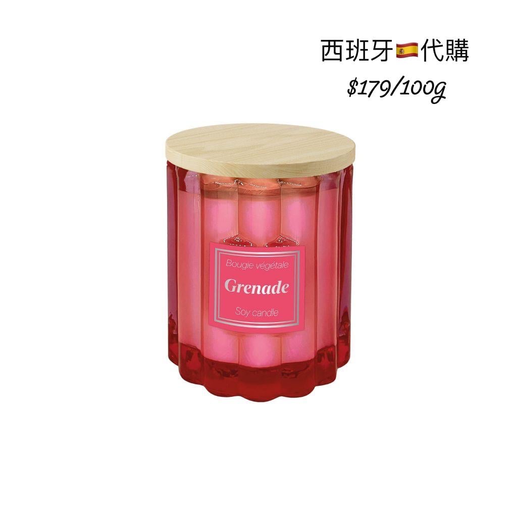 香氛大豆蠟燭(Bougie végétale Soy Candle) 外型為彩色玻璃瓶+木蓋設計,容量通常為大豆蠟香氛蠟燭,屬典雅法式風格。 🍒 Grenade(石榴) 中文名稱:石榴香氛蠟燭 🌸香味特色 • 果香清甜但不過於濃郁 • 石榴特有的微酸香調讓氣味更耐聞 • 氣味較成熟、溫柔,不是甜膩的果香 🌿香氛調性 • **前調:**石榴果香 • **中調:**紅果調 • **後調:**淡雅花香、果皮香 屬於清甜系、通風後仍能留香。