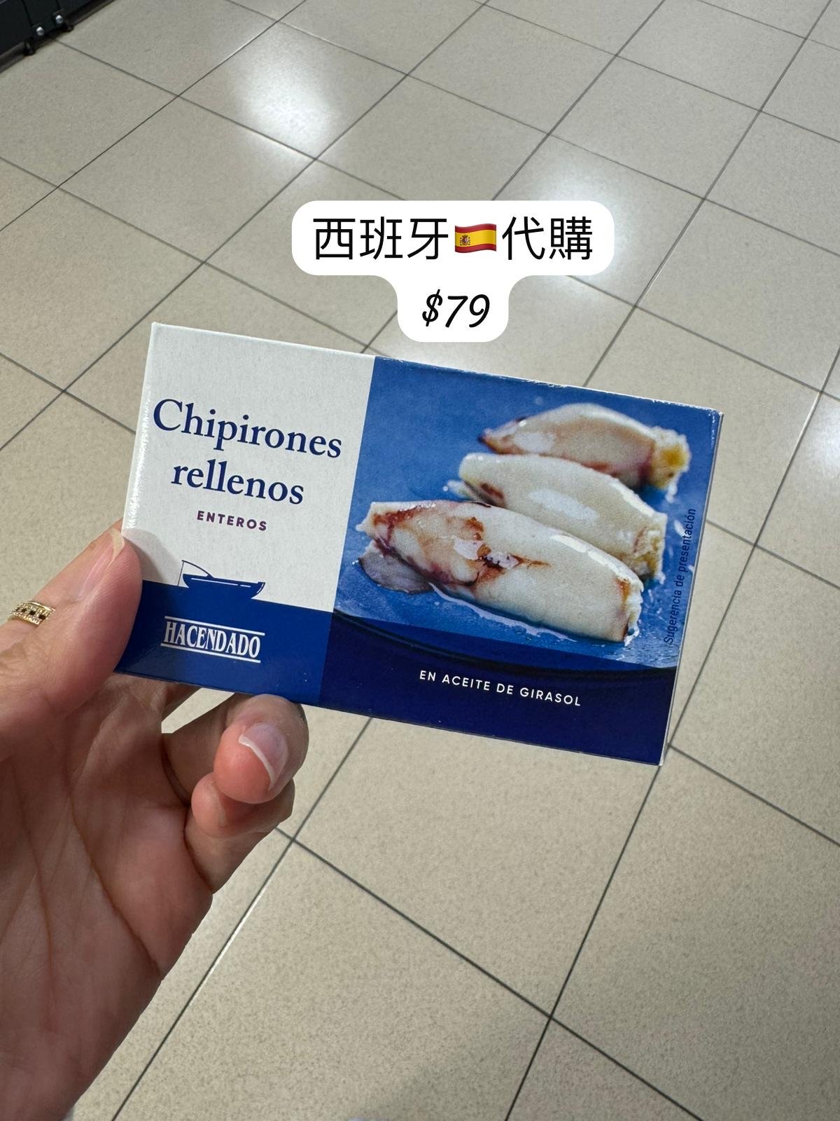 🦑 Hacendado 整隻釀小魷魚罐頭(Chipirones Rellenos Enteros) 🇪🇸 精選地中海海味 · 經典西班牙家常料理 享受地中海的原始風味! Hacendado Chipirones Rellenos Enteros 是西班牙傳統的海鮮佳餚, 選用新鮮小魷魚(Chipirones)整隻填餡製成, 以葵花籽油(aceite de girasol) 浸製保存,保持鮮嫩多汁與天然香氣。 ⸻ 🍴 產品特色 • 整隻魷魚填餡(Rellenos Enteros): 每隻小魷魚均由人工填入細碎的魷魚肉與香料餡料,口感層次豐富。 • 採用葵花籽油保鮮(En Aceite de Girasol): 油質輕盈,能維持魷魚肉質柔嫩並提升風味。 • 經典西班牙風味: 是家庭常備的冷盤小食或熱菜配料,常見於Tapas餐廳中。 • 即開即食: 可冷食或加熱食用,開罐即可享受地中海海鮮風味。 ⸻ 🍽️ 建議食用方式 1. 冷盤享用: 直接開罐搭配檸檬汁或橄欖油食用。 2. 熱食料理: 可用平底鍋稍微加熱後搭配白飯、麵包或義大利麵。 3. 創意吃法: 可加入沙拉、Tapas拼盤或搭配番茄醬汁調味。 ⸻ 📦 產品資訊 • 品牌: Hacendado(Mercadona 自有品牌) • 名稱: Chipirones Rellenos Enteros • 中文: 整隻釀小魷魚罐頭 • 主要成分: 小魷魚、葵花籽油、魷魚餡料、鹽 • 內容量: 約 3 份裝(視包裝而定) • 產地: 西班牙