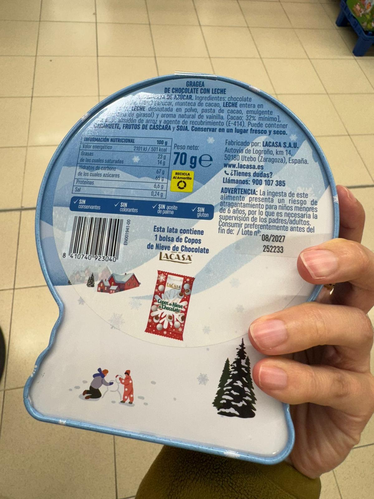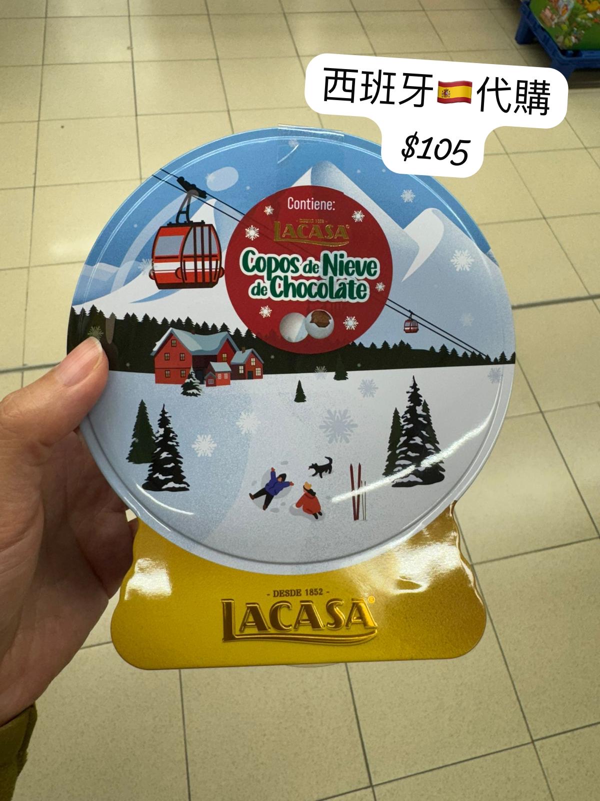 🔴 ❄️ LaCasa 聖誕雪花朱古力禮盒(Copos de Nieve de Chocolate) 🇪🇸 由西班牙百年朱古力品牌 LaCasa(創立於1852年) 推出之冬季限定款。 🌟 產品特色 • 雪花造型朱古力球:外層為香濃牛奶朱古力(Chocolate con Leche),內餡包含香脆榛果。 • 濃郁可可風味:採用至少 32% 可可含量,口感滑順、甜而不膩。 • 無防腐劑 / 無人工色素 / 無棕櫚油(Sin Conservantes, Sin Colorantes, Sin Aceite de Palma)。 • 包裝設計靈感來自冬季雪景:鐵盒上繪有滑雪場、纜車與雪人圖案,充滿節日氣氛。 🎁 禮盒內容 • 淨重:70g • 內含 1 包雪花朱古力球(Copos de Nieve) • 鐵盒可重複使用或收藏。 💡 保存建議 請存放於陰涼乾燥處,避免陽光直射或高溫環境。