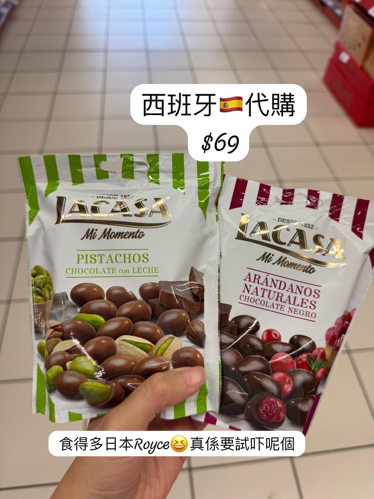 🌰 LaCasa Mi Momento 開心果牛奶巧克力 / 黑巧克力蔓越莓 • 品牌:LaCasa(西班牙巧克力品牌,創立於1852年) • 口味: • 綠包裝:牛奶巧克力開心果(Pistachos Chocolate con Leche) • 紫包裝:黑巧克力蔓越莓(Arándanos Naturales Chocolate Negro) • 特點: • 採用高品質可可與堅果、果乾製作 • 口感層次豐富,甜中帶自然果香 • 獨立小袋包裝,方便隨身享用 • 適合:下午茶、外出零食、辦公提神點心