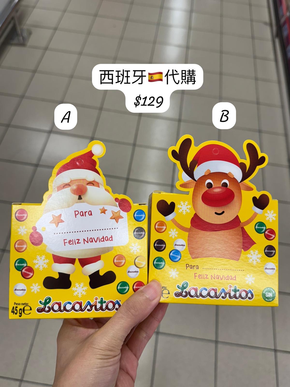 🔴 🎅 Lacasitos 聖誕限定朱古力糖(Feliz Navidad Edition) 🇪🇸 西班牙家喻戶曉的彩色朱古力品牌 Lacasitos 推出的節慶限定款。 🎁 聖誕包裝主題 • 兩款造型: 🎅 聖誕老人(Papá Noel) 🦌 馴鹿(Reno) • 包裝上印有 “Para ____ / Feliz Navidad”,可填上收禮人名字,非常適合送禮。 🍬 特點 • 外層彩色糖衣,內層香濃牛奶朱古力。 • 無麩質(Sin Gluten),小朋友也能安心食用。 • 可愛造型、節日限定,適合聖誕交換禮物。 規格:45g 產地:西班牙
