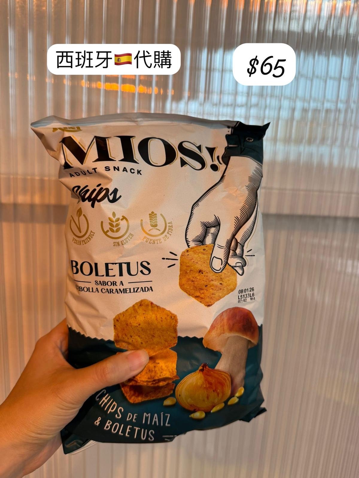 🍄 MIOS! Chips de Maíz & Boletus(玉米蘑菇脆片) • 品牌:MIOS! • 口味:牛肝菌與焦糖洋蔥(Boletus sabor a cebolla caramelizada) • 特點: • 不含麩質(Sin gluten) • 適合成人的高質感零食(Adult Snack) • 使用天然玉米與菇類製成,風味鹹香濃郁。 • 建議搭配:紅酒、啤酒或作為開胃小食。