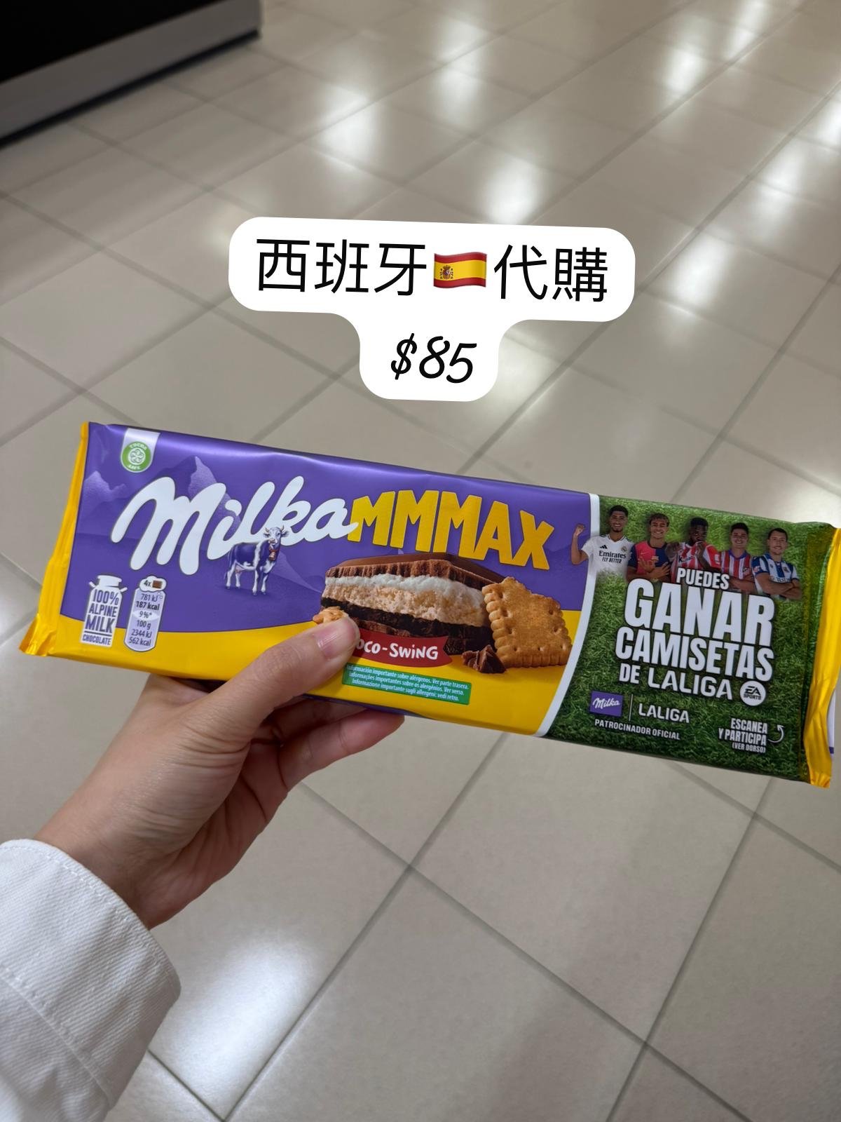 Milka MMMAX Choco-Swing 牛奶巧克力餅乾夾心巧克力 ⸻ 📦 產品資訊 • 品牌: Milka(妙卡) • 系列: MMMAX 系列(超大份量系列) • 口味: Choco-Swing — 餅乾與奶油夾心牛奶巧克力 • 重量: 約 270 克(實際依包裝略有不同) • 原產地: 歐洲(通常為德國或波蘭生產) • 主要成分: • 阿爾卑斯牛奶巧克力(100% Alpine Milk) • 香草奶油夾心 • 香脆餅乾層 ⸻ 🍴 口感與特色 • 外層是 香濃柔滑的 Milka 牛奶巧克力; • 中間夾有 香草奶油餡 和 鬆脆餅乾層,帶來多重口感體驗; • 整體口感甜而不膩,結合滑順與脆口的層次感。 ⸻ 🎯 特點與推薦 • 大份量(MMMAX)設計,適合分享或派對享用; • 採用 100% 阿爾卑斯牛奶 製作,口感香滑; • 包裝上印有 LaLiga(西甲聯賽)合作活動,可掃描參與抽獎贏取球衣(活動時間依地區不同)。