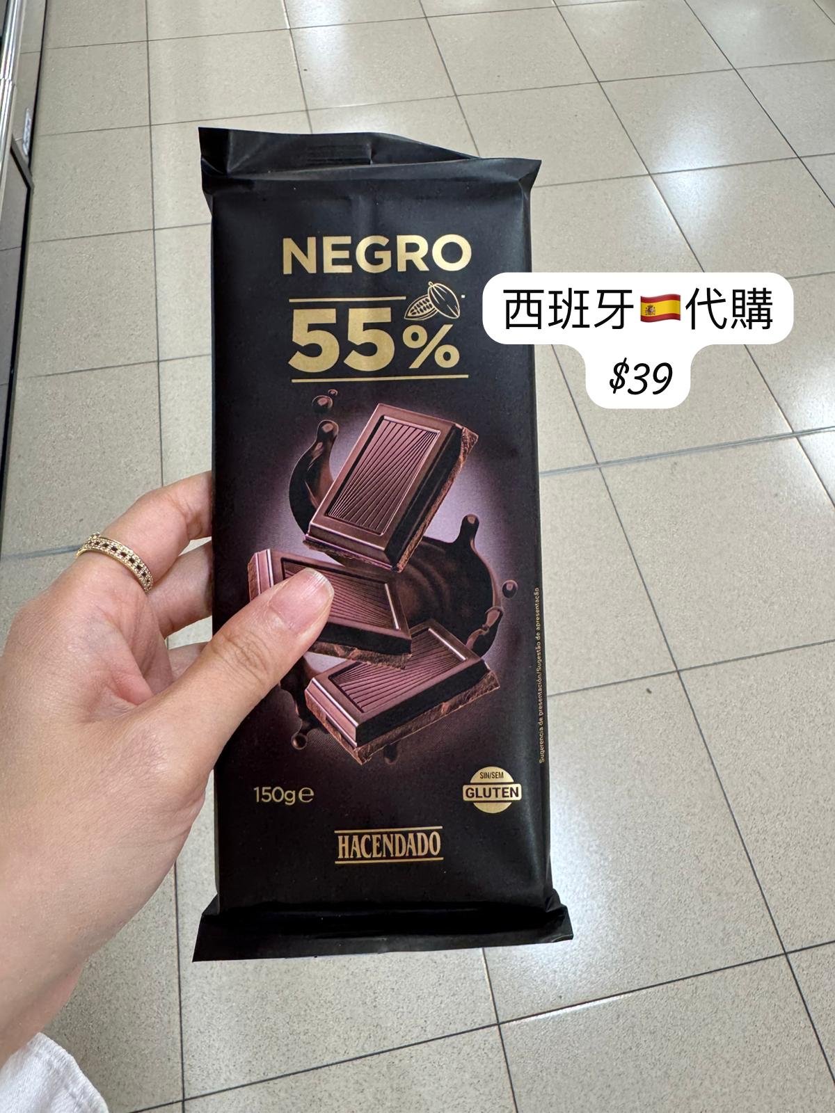 NEGRO 55% — 表示這是一款 可可含量 55% 的黑巧克力。 ⸻ 📦 產品資訊 • 重量: 150 公克(150g) • 品牌: Hacendado(西班牙 Mercadona 超市自有品牌) • 可可含量: 55%,屬於中度黑巧克力,口味介於苦與甜之間。 • 無麩質(SIN GLUTEN): 適合對麩質過敏或患有乳糜瀉(麩質不耐症)的人食用。 ⸻ 🍴 口感與用途 • 口感: 可可味濃郁,但不會過於苦澀,帶有一點甜味。 • 用途: 可直接食用,也常用於烘焙、製作甜點或搭配咖啡。