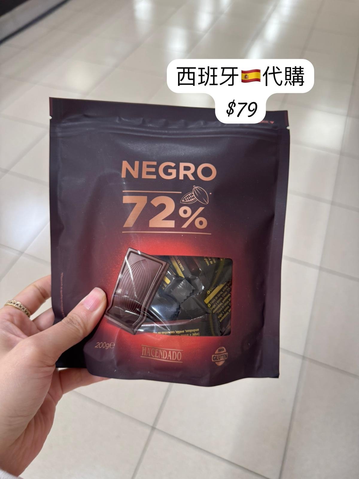 NEGRO 72% — 表示這款巧克力的 可可含量為 72%,屬於 偏苦型的高純度黑巧克力。 ⸻ 📦 產品資訊 • 重量: 200 公克(200g) • 品牌: Hacendado(西班牙 Mercadona 自有品牌) • 可可含量: 72%,比 55% 的黑巧克力更濃郁、甜度更低。 • 無麩質(SIN GLUTEN): 適合麩質不耐症或需無麩質飲食者食用。 • 包裝形式: 獨立小包裝巧克力塊,方便分食或隨身攜帶。 ⸻ 🍴 口感與風味 • 口感特徵: • 可可味濃厚,帶有淡淡的苦味與烘焙香氣; • 甜度較低,適合喜歡濃郁黑巧風味的人。 • 建議用途: • 可直接食用,搭配咖啡、紅酒風味更佳; • 也可用於烘焙、製作甜點或裝飾蛋糕。