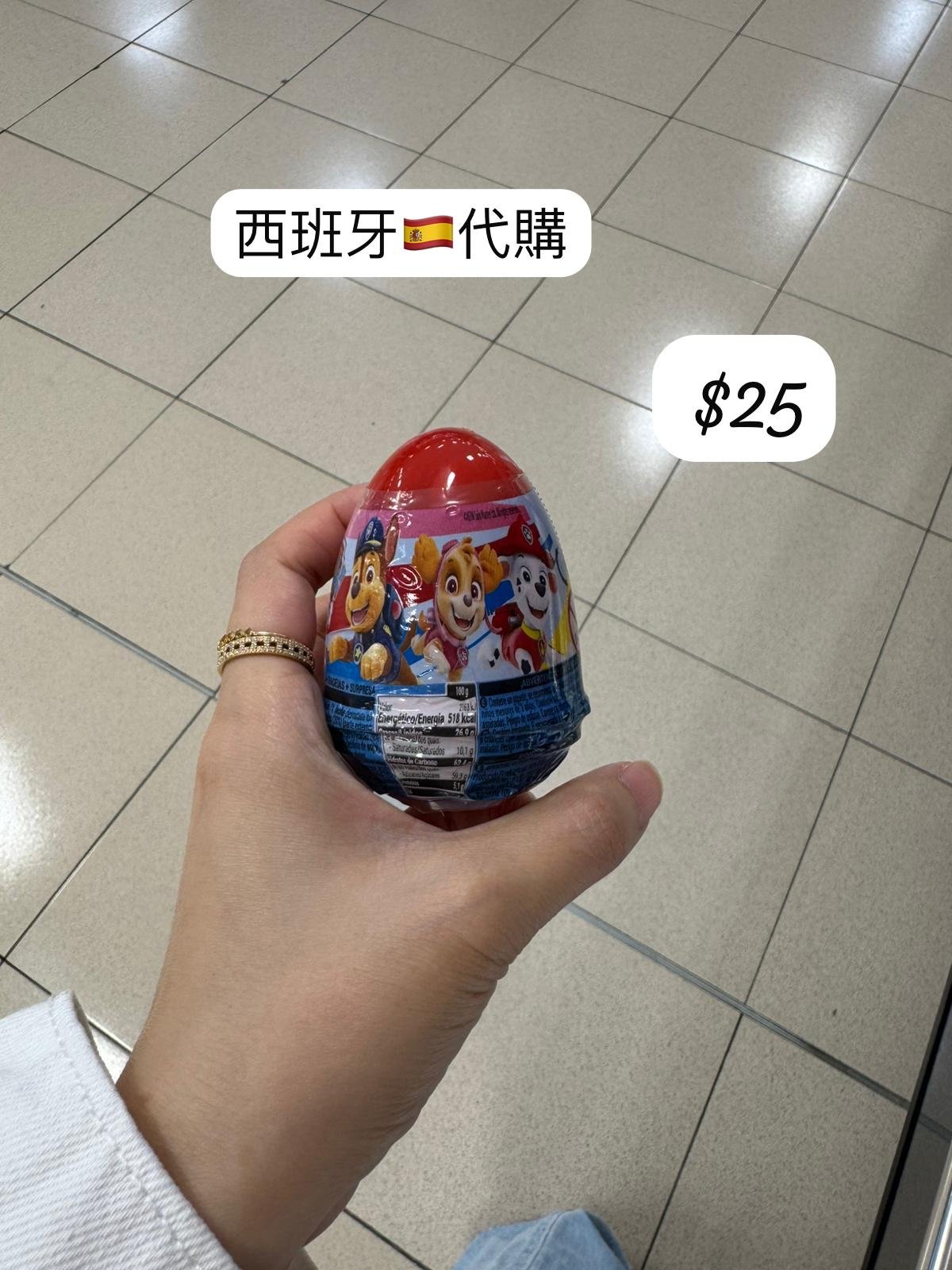 🐾 PAW Patrol Surprise Chocolate Egg 汪汪隊驚喜巧克力蛋 🍫 巧克力 × 驚喜玩具 × 超人氣汪汪隊英雄 這款驚喜巧克力蛋結合了香濃巧克力與趣味玩具,是小朋友們最喜歡的經典組合!每顆蛋內都藏有一個隨機的《汪汪隊立大功》主題小玩具,讓孩子在享受甜點的同時,也能收集喜愛的角色。 ⸻ ✨ 產品特色 • 可可香濃:外層由牛奶巧克力與白巧克力雙層製成,入口滑順、甜而不膩。 • 驚喜玩具隨機附贈:內含 1 款《PAW Patrol 汪汪隊》系列角色玩具,可能是 Chase、Marshall、Skye 等人氣角色之一。 • 無麩質配方(Sin Gluten),適合兒童食用。 • 造型可愛:蛋型包裝色彩繽紛,印有動畫角色圖案,吸引孩子目光。