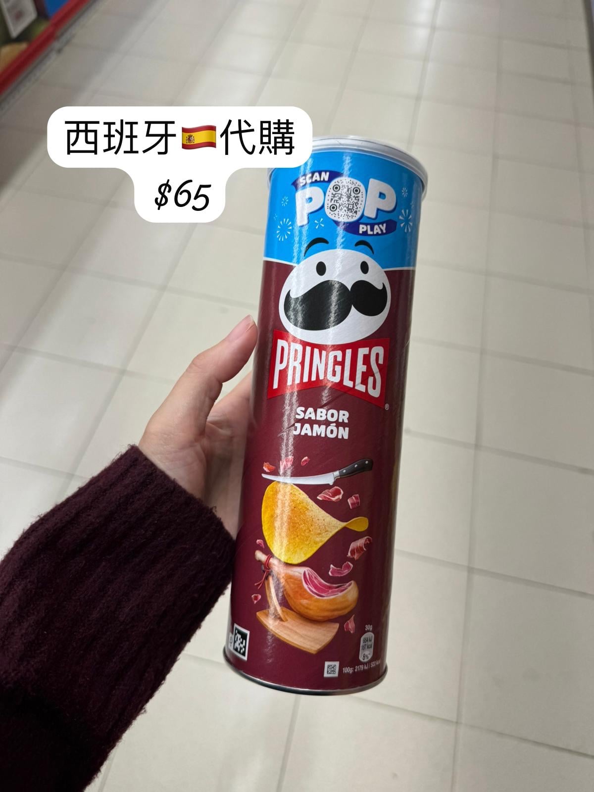 🥔 Pringles 火腿味(Sabor Jamón) 類型: 馬鈴薯乾片 口味: 西班牙風味火腿 特色: • 酥脆片狀薯片,搭配濃郁的西班牙火腿鹹香風味 • 易入口、不油膩、口味香濃 • 筒裝設計方便攜帶 • 西班牙當地非常熱門的在地限定口味 適合: 喜歡鹹香肉味、小酌、追劇配零食的人