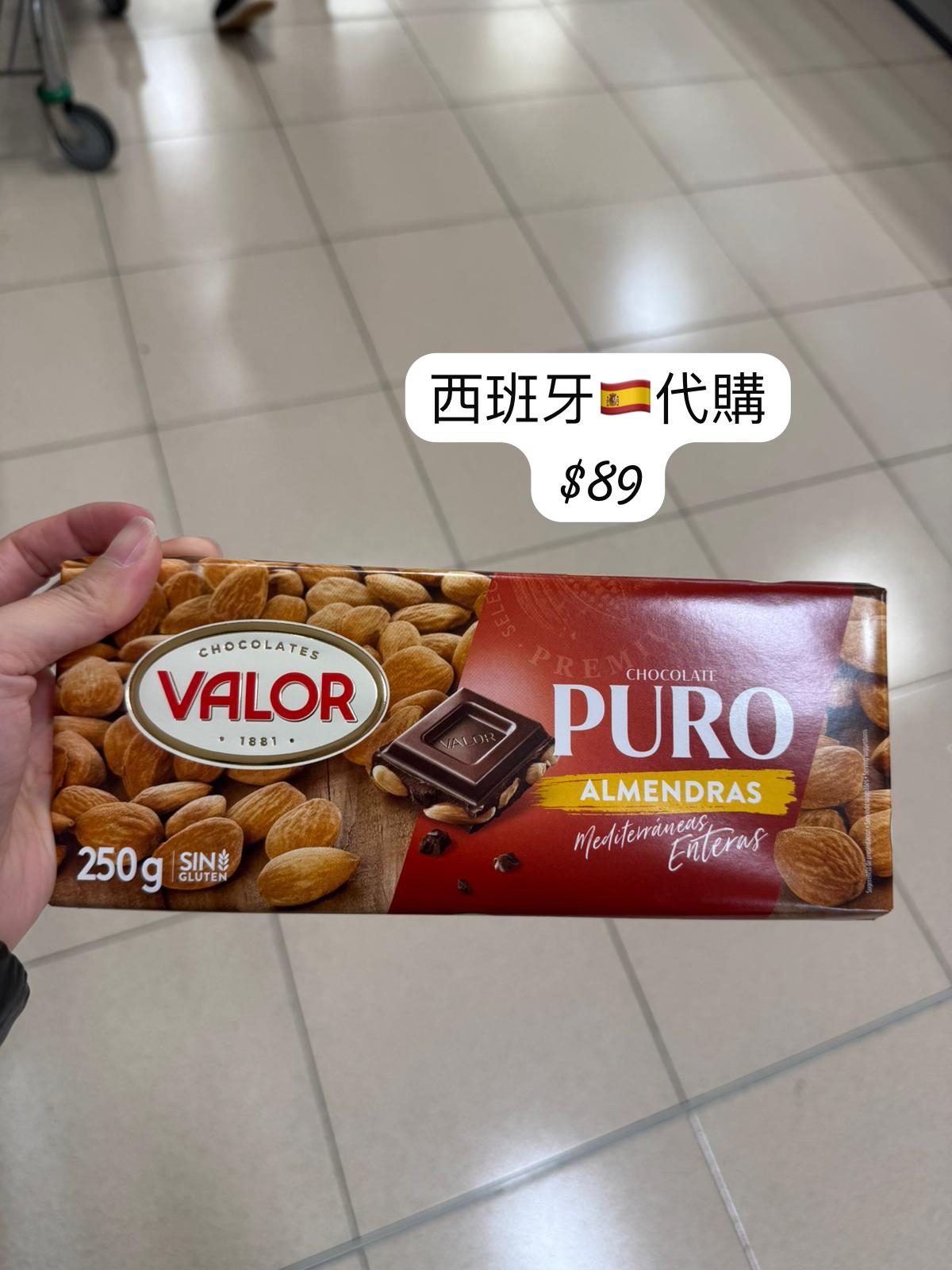 🍫 VALOR 純黑巧克力杏仁(Puro Almendras)250g 產品名稱: VALOR 巧克力(西班牙品牌) 口味: 純黑巧克力 + 整顆杏仁 重量: 250g 特色: • 使用西班牙 VALOR 百年巧克力工藝(創立於 1881) • 高純度黑巧克力,搭配 完整地中海杏仁 • 濃郁微苦巧克力風味,帶堅果香脆口感 • 無麩質(SIN GLUTEN) • 適合愛吃黑巧克力、堅果或偏好低甜者